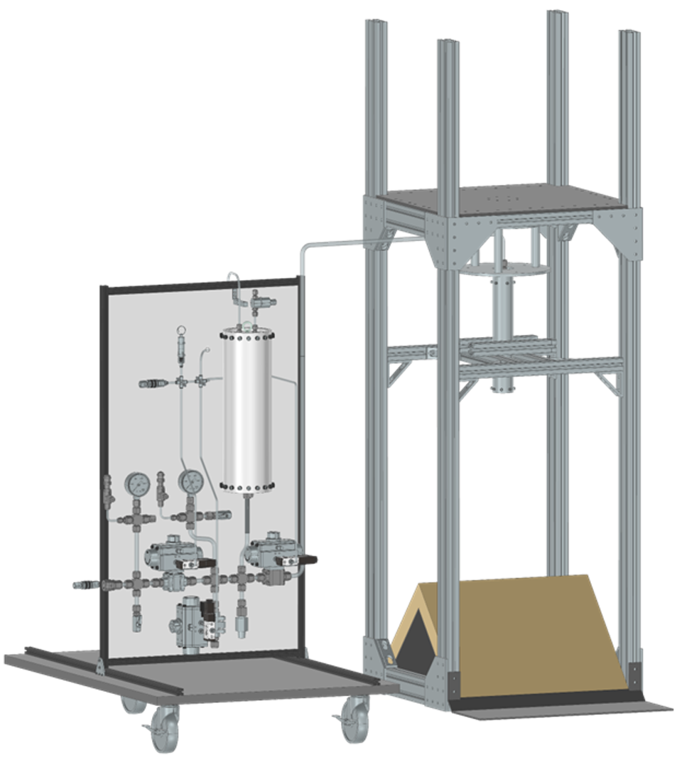 The proposed design replicates key flight conditions through a vertical downward-firing configuration incorporating a symmetrical prismatic deflector plate to ensure anchoring and stability. The system dimensions were defined based on transportation and operational constraints. Structural and plumbing components were analyzed using hand calculations and finite element analysis, with a minimum factor of safety of 5 under a nominal thrust of 1 kN and of 4 on the maximum operating pressure of 1000 psi.